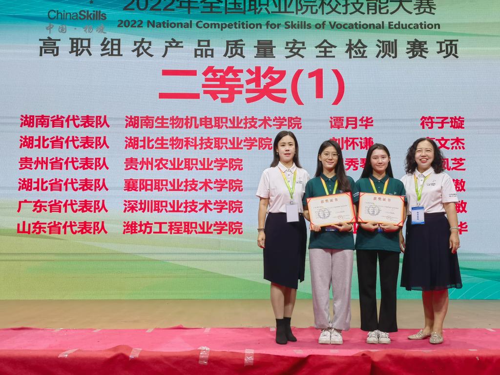 8月24日至26日,由教育部等部门主办的2022全国职业院校技能大赛“农产品质量安全检测”赛项在陕西杨凌举行。经过激烈角逐,由我校食品药品学院朱咏欣、黄卓敏2名学生组成的广东省代表队,在本次赛项中取得了二等奖的好成绩。