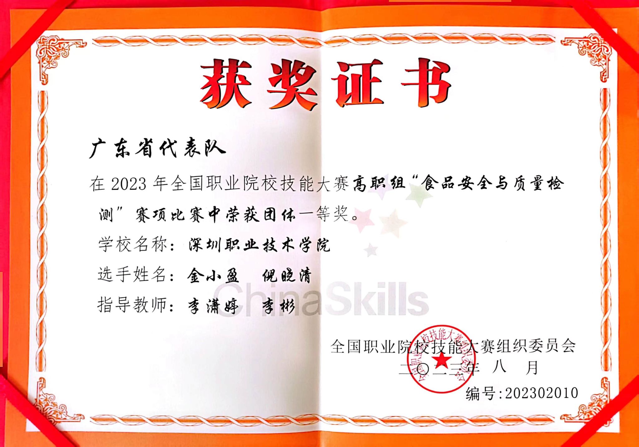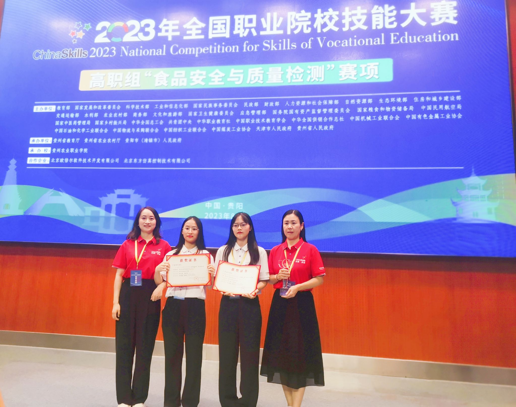 8月16日-20日,2023年全国职业院校技能大赛高职组“食品安全与质量检测”赛项在贵州农业职业学院举行,来自全国31个省(区、市)职业院校的60支队伍同台竞技。经过激励角逐,我校食品药品学院李潇婷、李彬、沈丽老师指导的学生倪晓清和金小盈凭借扎实的专业知识、娴熟的技能,沉着应战,团结协作,一路破关斩将,最终获得赛项团体一等奖。