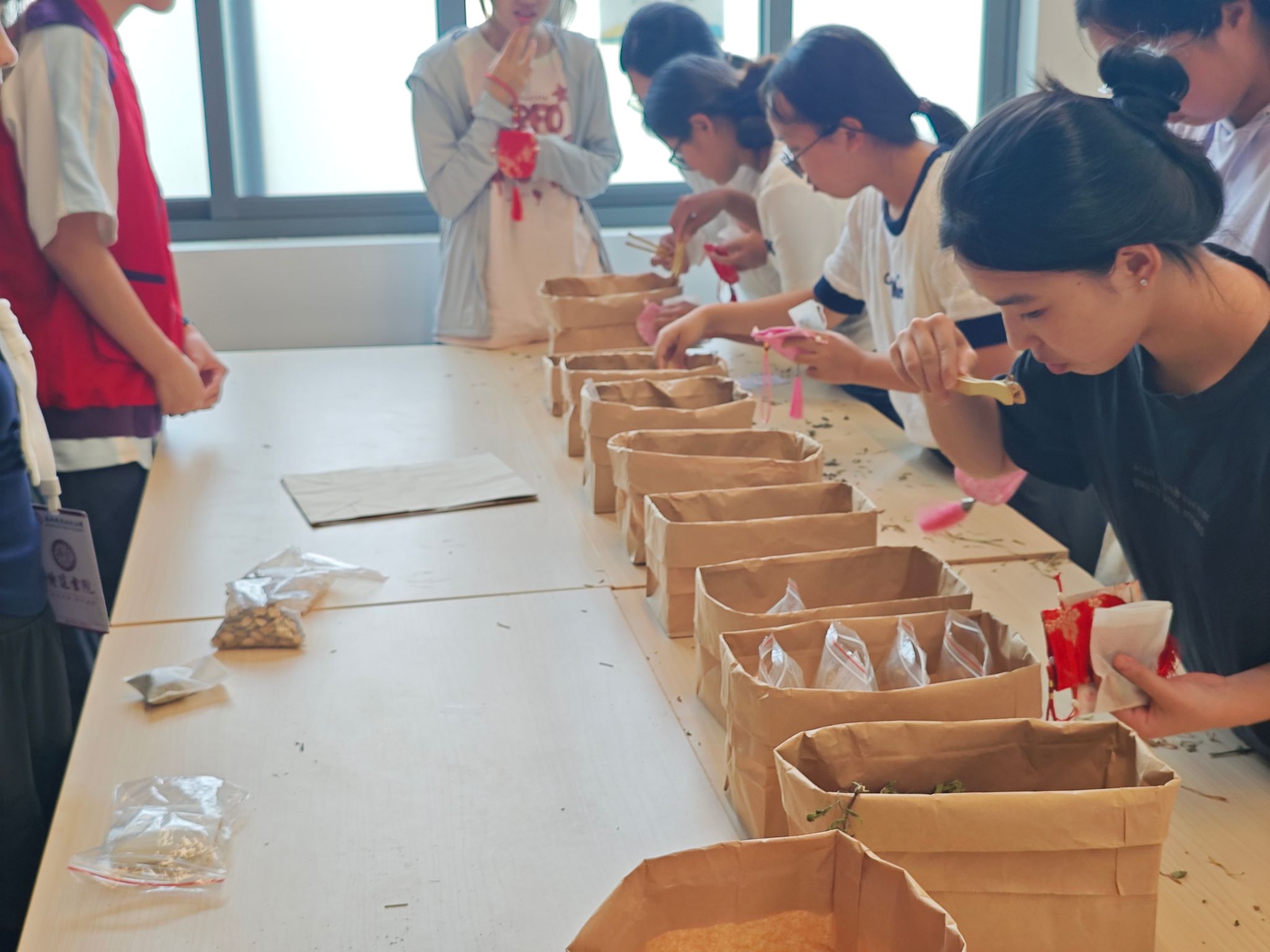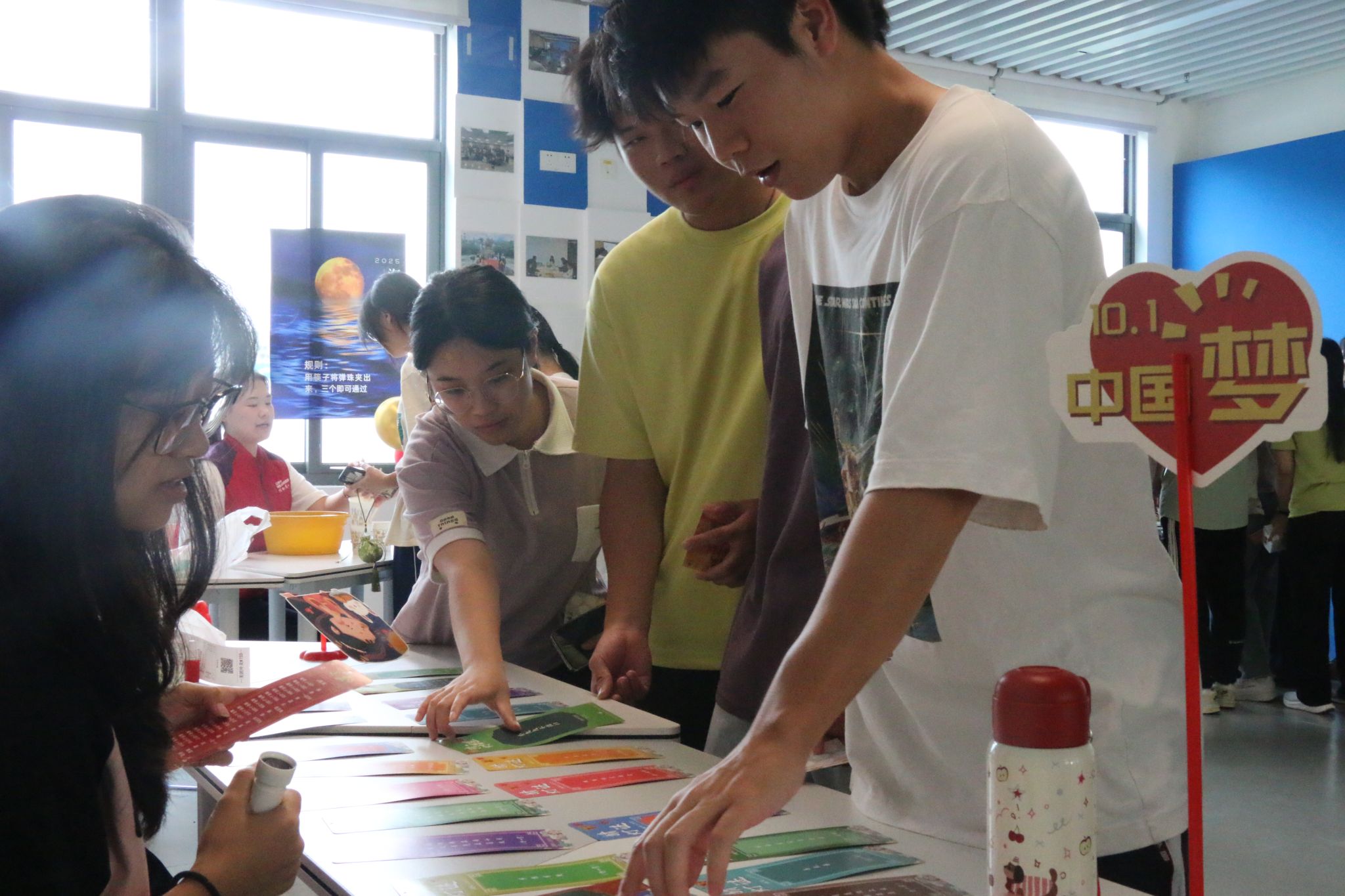 游园会以十项特色活动搭建起双节体验平台,覆盖文化互动、趣味竞技与手工创作,让学子全方位沉浸过节。“月饼盲品”里,蒙眼的同学细品从莲蓉到五仁的经典口味,在味蕾试探中解锁传统美食的魅力;“趣味谜语闯关”摊位前,谜题巧妙融入“中药材别名”“食品安全常识”等专业内容,学子们或低头思索、或组队讨论,解谜时既学了知识,又添了乐趣;“投壶”“圆月套圈”“玉兔投月”“海底捞月”等游戏区更是热度高涨,同学们瞄准目标、手眼配合,成功时的欢呼与失利后的玩笑让现场氛围持续升温;“香囊DIY”环节最具食药特色,大家挑选艾叶、丁香等草本原料,一针一线缝制出专属香囊,指尖满是自然芬芳;“书签写祝福”处,学子们用笔墨写下“愿国泰民安,食药安康”等寄语,将心意定格在纸张上;“桂香吹落月”以吹乒乓球过“桂香小径”的形式趣味开赛,灵动玩法引得众人围观;“enjoy猜猜猜”特色活动更是趣味十足。此外,活动设置点赞兑奖与通关抽奖,马克杯、笔、玉兔花灯等奖品,让学子们集齐印章时多了份期待,兑换到奖品的笑容格外灿烂。