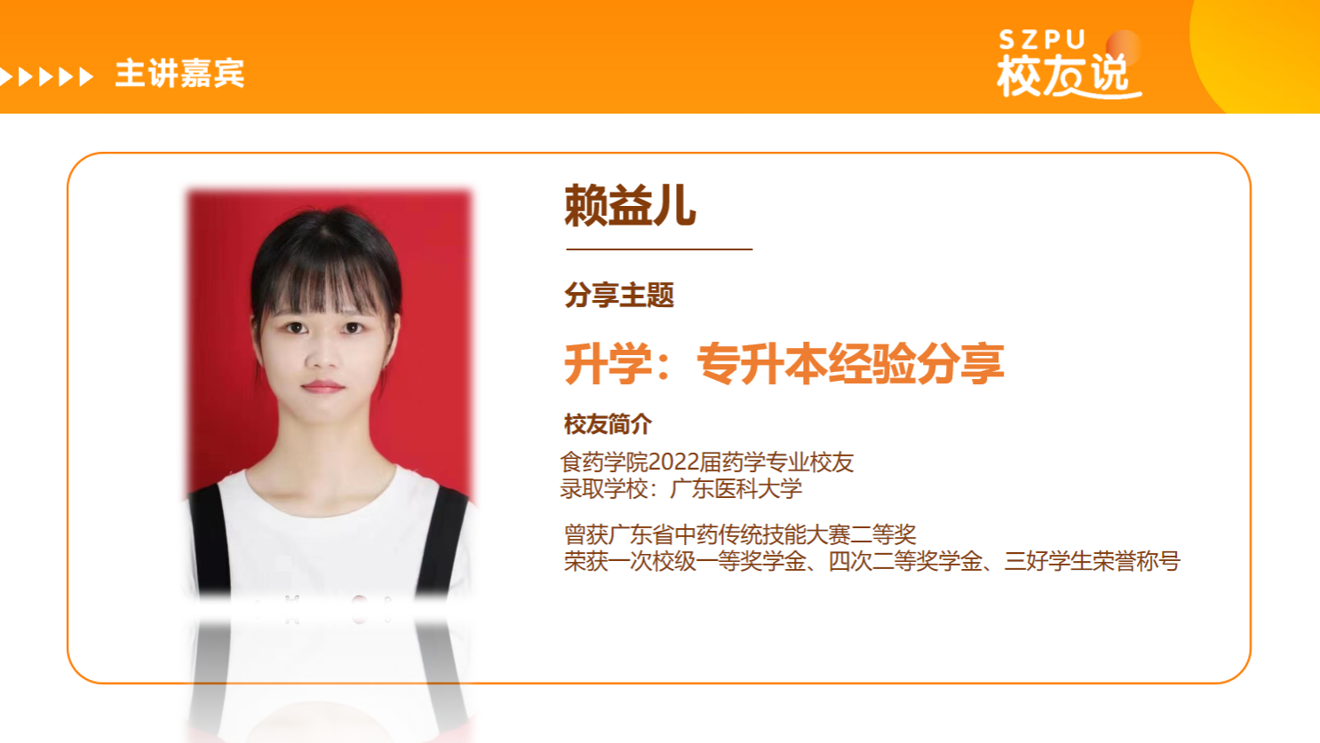 11月18日,为营造良好学风,切实为同学们解决实际学业困惑,树立榜样示范作用,博达书院食药团委实践部线上举办了以专升本经验分享为主题的校友讲座,由食药学院2022届药学专业校友赖益儿主讲。赖益儿同学为原2019级药学专业学生,在校期间曾获广东省中药传统技能大赛二等奖,校级一等奖学金、四次二等奖学金及三好学生等荣誉称号。